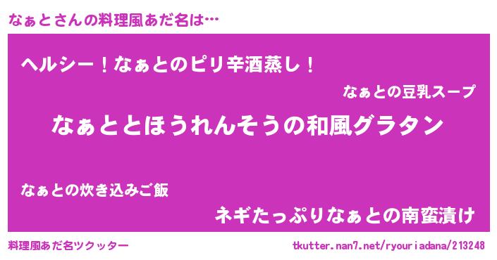 | 女子向けラノベタイトル風あだ名 | 『なぁとの玉の輿計画!』『闇のなぁと』 |