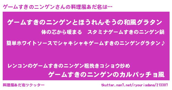 | 男性向けラノベタイトル風あだ名 | 『ゲームすきのニンゲンの嫁は女の子じゃないと思った?』 |