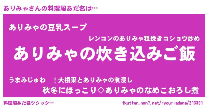 | 男性向けラノベタイトル風あだ名 | 『うちのありみゃが世界を掌握している!』 |