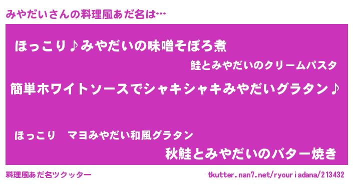 | 男性向けラノベタイトル風あだ名 | 『みやだいの嫁は女の子じゃないと思った?』 |