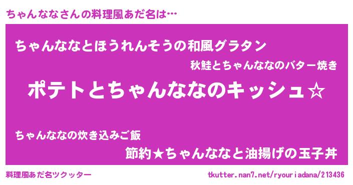 | 男性向けラノベタイトル風あだ名 | 『ちゃんななの嫁は女の子じゃないと思った?』 |