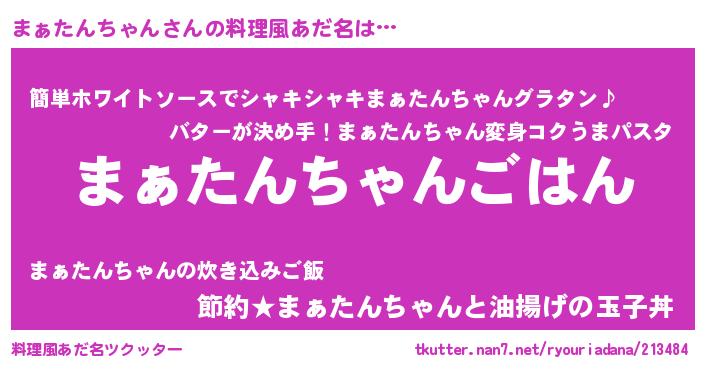 | 胡散臭い通販商品みたいなあだ名 | 『信頼と実績のサプリメント…その名も「まぁたんちゃん」』 |