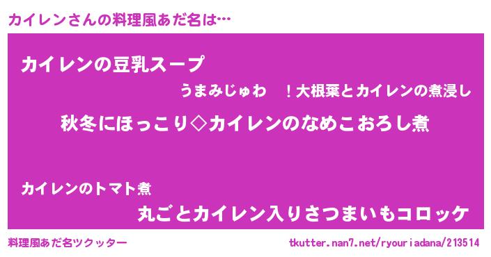 | 男性向けラノベタイトル風あだ名 | 『カイレンに滅ぼされるだけの簡単なお仕事です』 |