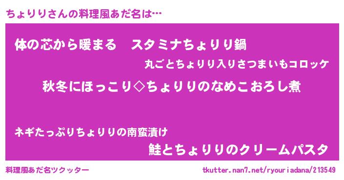| 男性向けラノベタイトル風あだ名 | 『ちょりりに滅ぼされるだけの簡単なお仕事です』 |