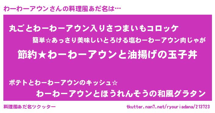 | 男性向けラノベタイトル風あだ名 | 『わーわーアウンの憂鬱』 |