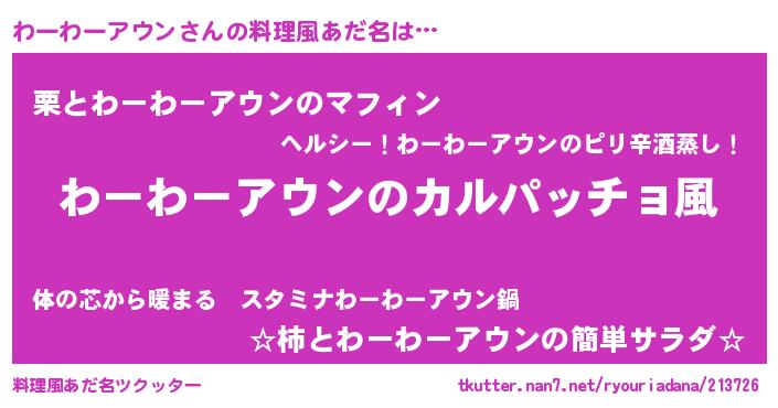 | 女子向けラノベタイトル風あだ名 | 『わーわーアウンが死なない童話 林檎のわーわーアウンの診療簿』 |