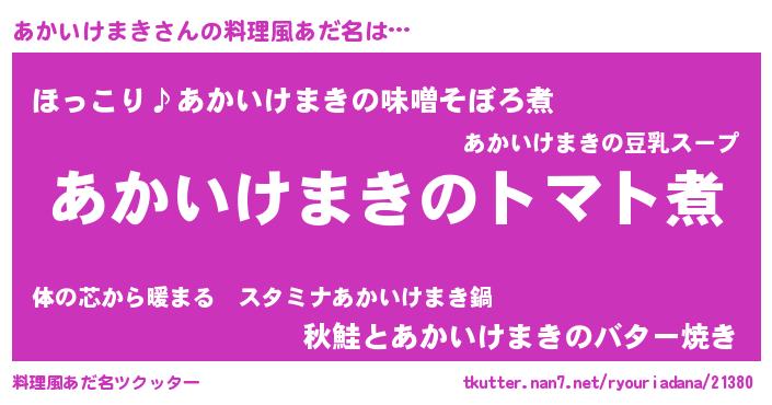 | 女子向けラノベタイトル風あだ名 | 『あかいけまき夫妻のなれそめ』 |