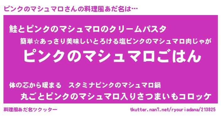 | 女子向けラノベタイトル風あだ名 | 『婚約破棄系悪役ピンクのマシュマロに転生したので、保身に走りました。』 |