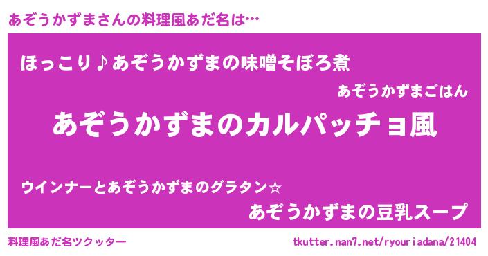 | 男性向けラノベタイトル風あだ名 | 『魔弾の王とあぞうかずま』 |