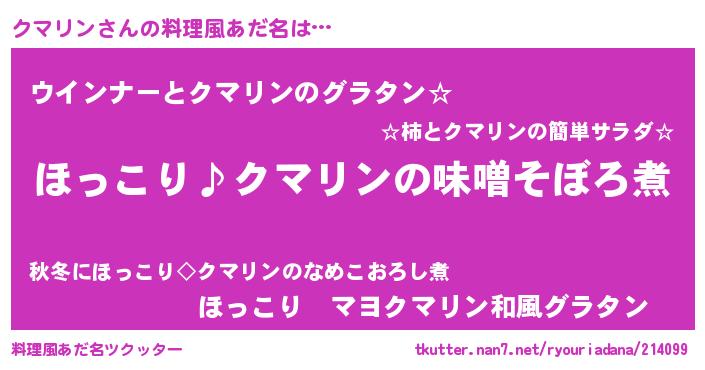 | ファンタジー風あだ名 | 『クマフェル』『エターナルクマリンー』 |