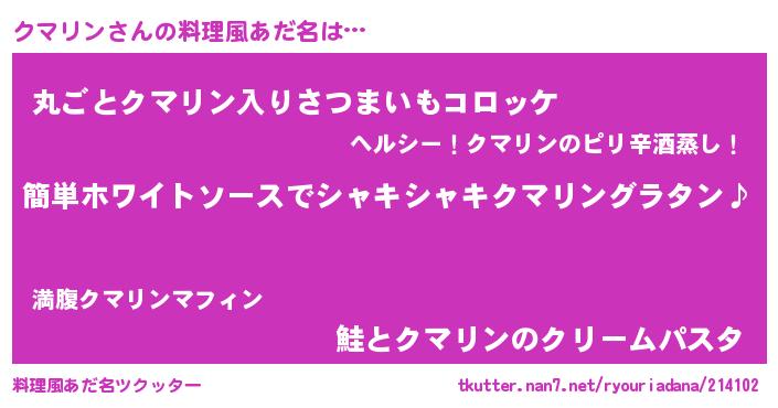| 男性向けラノベタイトル風あだ名 | 『クマリンの嫁は女の子じゃないと思った?』 |