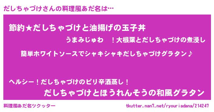 | 胡散臭い通販商品みたいなあだ名 | 『全米が絶賛したサプリメント…その名も「だしちゃづけ」』 |