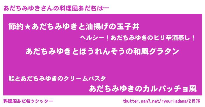 | 男性向けラノベタイトル風あだ名 | 『あだちみゆき~年齢イコール彼女いない歴の魔法使い~』 |