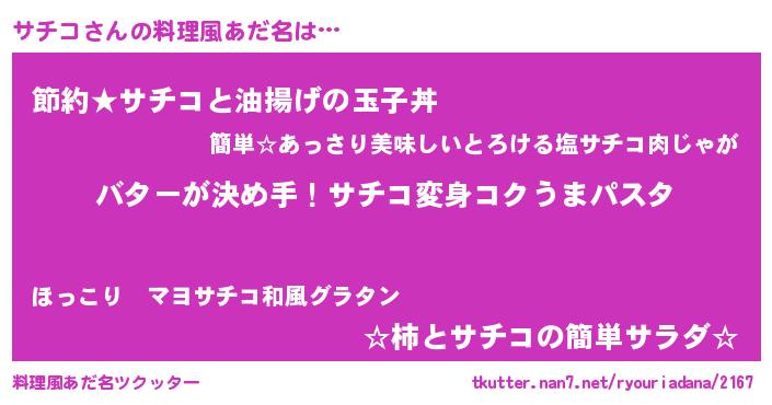 | 女子向けラノベタイトル風あだ名 | 『サチコ恋絵巻』『サチコ姫と円卓の騎士』 |