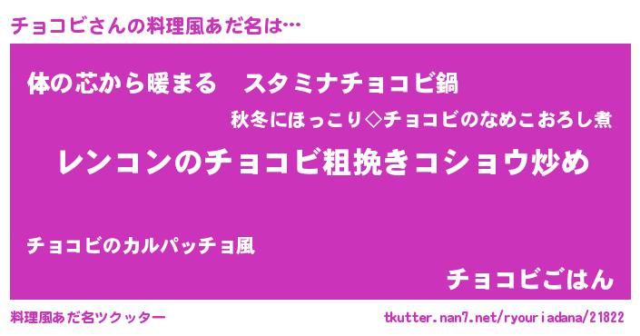 | 女子向けラノベタイトル風あだ名 | 『チョコビなんてお断りですっ。』 |