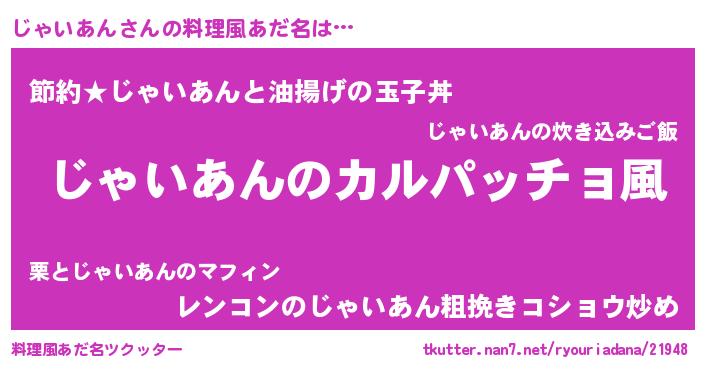 | 女子向けラノベタイトル風あだ名 | 『じゃいあんが死なない童話 林檎のじゃいあんの診療簿』 |