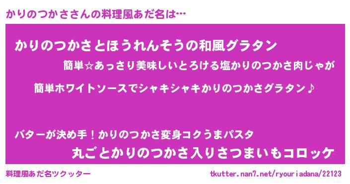 | ヘコむあだ名 | 『かりぷりん』『かりのつかさ(笑)』 |