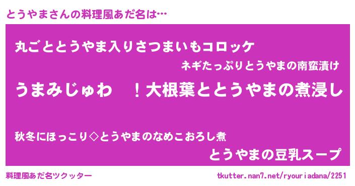 | 胡散臭い通販商品みたいなあだ名 | 『運命の人と巡り会える高級そうな皿…その名も「とうやま」』 |