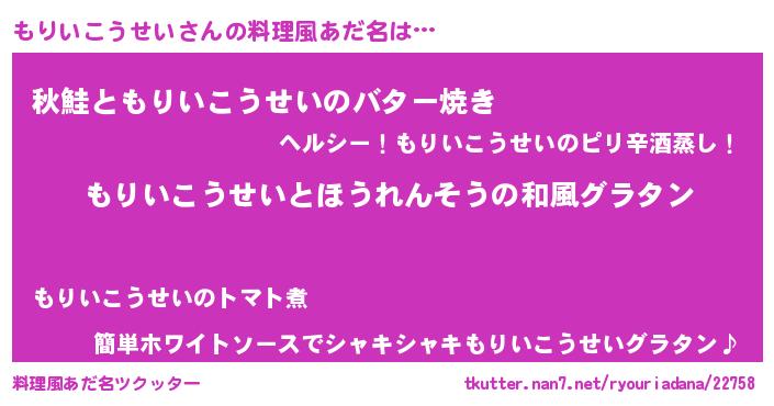 | 女子向けラノベタイトル風あだ名 | 『もりいこうせいの玉の輿計画!』 |