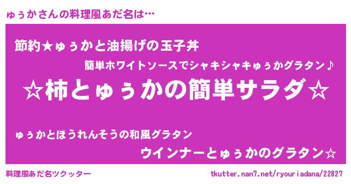 | 男性向けラノベタイトル風あだ名 | 『緋弾のュゥカ』『ゅぅかの憂鬱』 |