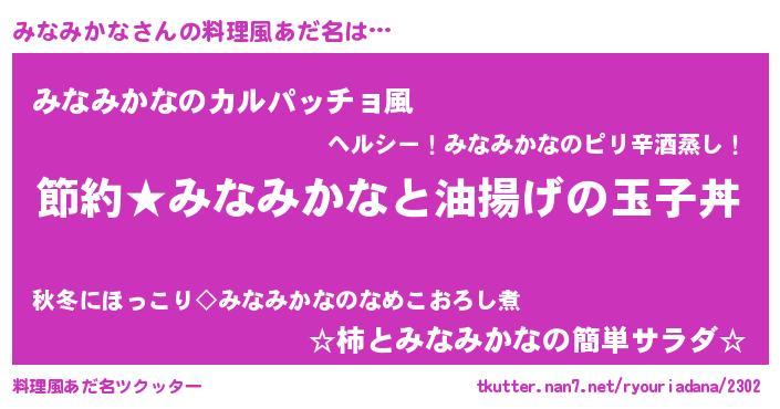 | ヘコむあだ名 | 『みなふぇ~』『みなみかな(小並感)』 |