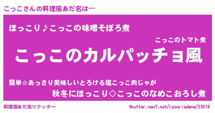 | 男性向けラノベタイトル風あだ名 | 『魔弾の王とこっこ』『こっこの憂鬱』 |