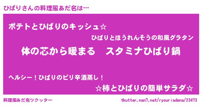 | 女子向けラノベタイトル風あだ名 | 『ひばりの雑貨屋さん』『闇のひばり』 |