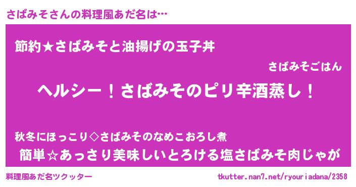 | 男性向けラノベタイトル風あだ名 | 『Re:さばみそから始める異世界生活』 |