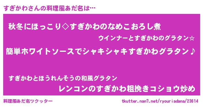 | 男性向けラノベタイトル風あだ名 | 『すぎかわの嫁は女の子じゃないと思った?』 |
