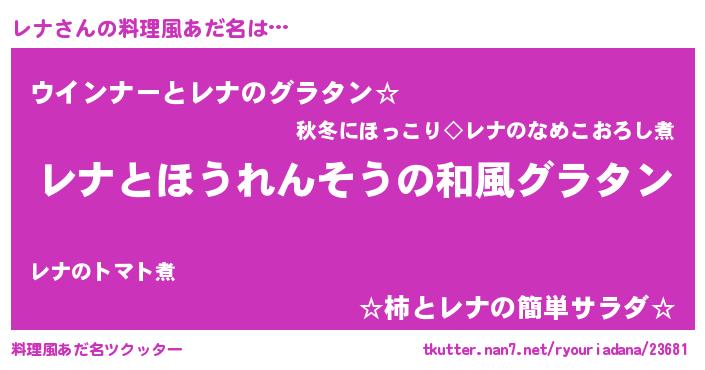 | 女子向けラノベタイトル風あだ名 | 『レナの玉の輿計画!』『レナ伯爵の花嫁』 |