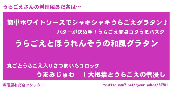| 男性向けラノベタイトル風あだ名 | 『転生したらうらごえだった件』 |