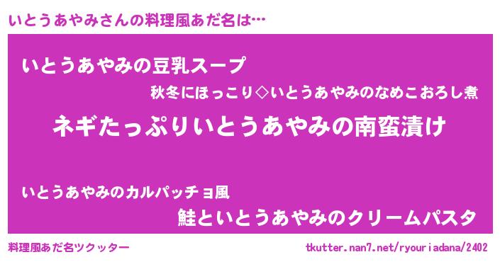 | 胡散臭い通販商品みたいなあだ名 | 『億万長者になれるブレスレット…その名も「いとうあやみ」』 |