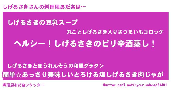 | 男性向けラノベタイトル風あだ名 | 『Re:しげるさきから始める異世界生活』 |