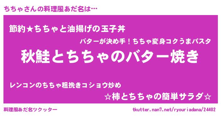 | 女子向けラノベタイトル風あだ名 | 『ちちゃの契約王妃』『ちちゃ恋絵巻』 |