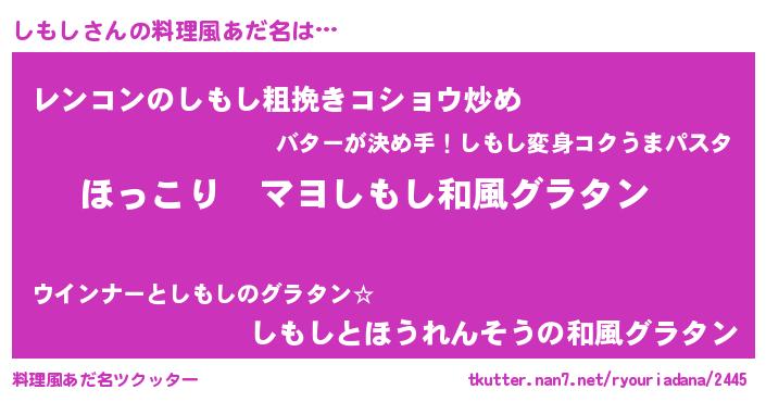 | 男性向けラノベタイトル風あだ名 | 『この素晴らしい世界にしもしを!』 |