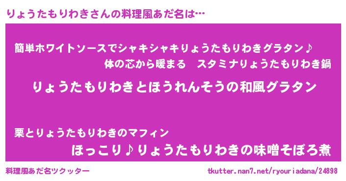 | 男性向けラノベタイトル風あだ名 | 『りょうたもりわき~年齢イコール彼女いない歴の魔法使い~』 |