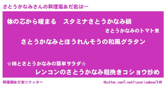 | ヘコむあだ名 | 『酢こんぶ』『さとうかなみ(遠い目)』 |