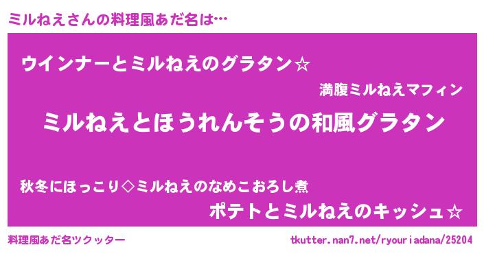 | 女子向けラノベタイトル風あだ名 | 『ミルねえの玉の輿計画!』 |