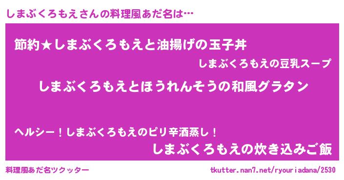 | 男性向けラノベタイトル風あだ名 | 『しまぶくろもえ~年齢イコール彼女いない歴の魔法使い~』 |