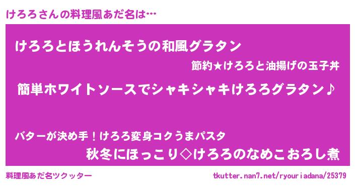 | 男性向けラノベタイトル風あだ名 | 『けろろの嫁は女の子じゃないと思った?』 |