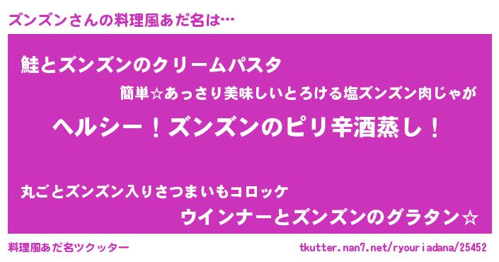 | 男性向けラノベタイトル風あだ名 | 『Re:ズンズンから始める異世界生活』 |