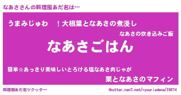 | 男性向けラノベタイトル風あだ名 | 『転生したらなあさだった件』 |