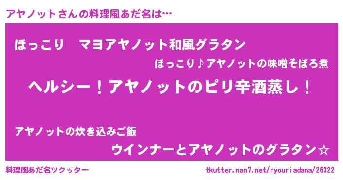 | 男性向けラノベタイトル風あだ名 | 『Re:アヤノットから始める異世界生活』 |