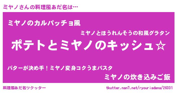 | 女子向けラノベタイトル風あだ名 | 『ミヤノの卵を拾いまして』 |
