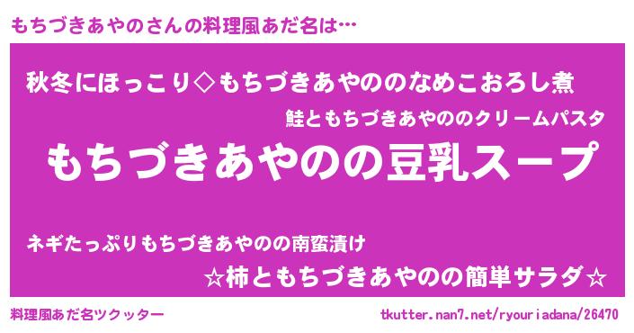 | ポケモン風あだ名 | 『ヒモチヅキアヤノ』『モチゴンZ』 |