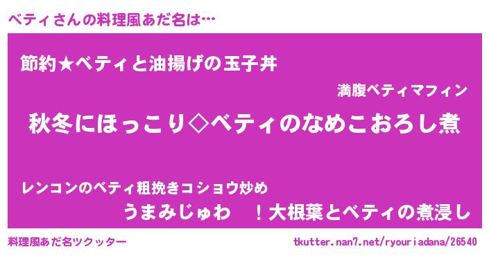 | 男性向けラノベタイトル風あだ名 | 『ベティに滅ぼされるだけの簡単なお仕事です』 |