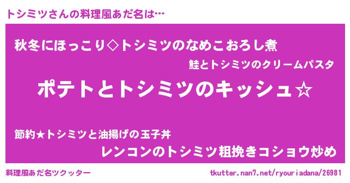 | 女子向けラノベタイトル風あだ名 | 『トシミツの卵を拾いまして』 |