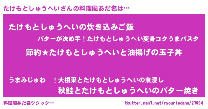 | ヘコむあだ名 | 『たけもー』『たけもとしゅうへい(震え声)』 |