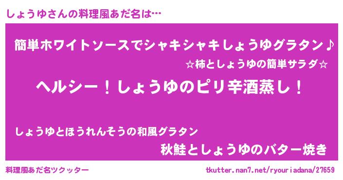 | 男性向けラノベタイトル風あだ名 | 『Re:しょうゆから始める異世界生活』 |