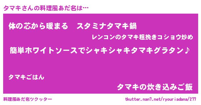 男性向けラノベタイトル風あだ名 | 『タマキの嫁は女の子じゃないと思った?』 |
